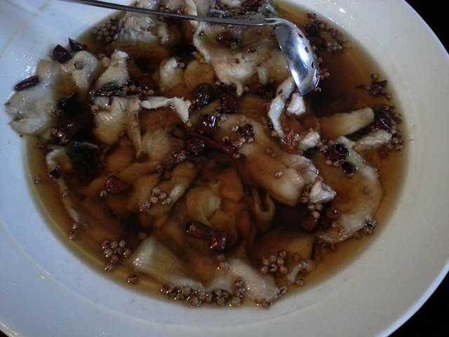椒麻鸡,鸡肉鲜嫩,辣度可以接受。是下饭的好菜。