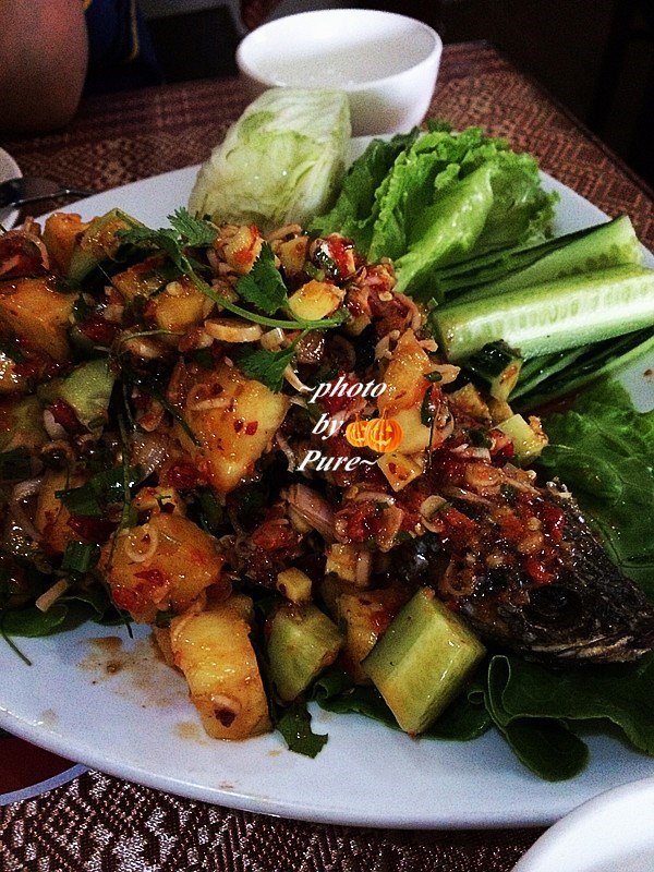 【三味鲈鱼】很大一盆!鲈鱼是炸过的。不知道原本是否新鲜。但是滋味地道的很啊~作为东南亚吃客的joe第一口就说很清迈的口味!说这个味道相当正宗。上面的菠萝颗粒酸酸的。放满了各种香料,我吃着有些辣,但是很和joe的口味,让他赞不绝口。旁边又铺着各种生的时蔬,小黄瓜,生菜。很解辣很有意思的一道菜