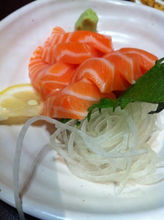 【三文鱼刺身】:虽然只有这么几片,但是食材新鲜度很不错,而且切的很厚实,一块下去很肥腻,很喜欢这种感觉,三文鱼在口中丝丝的清甜,蘸上酱油芥末,更加的刺激爽!