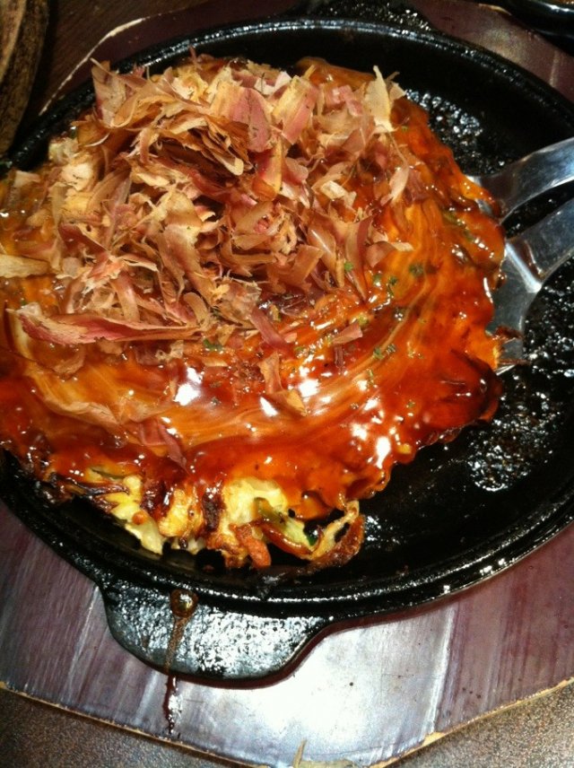 【广岛烧】:只见木鱼花在上面舞动,在勾引着我们的食欲,想咬征服它的感觉,一口咬下去,非常的满足,都是配料食材,吃口很松软,味道很美妙,很鲜美的感觉,在口里它在跳舞的感觉,非常的神奇,好吃!