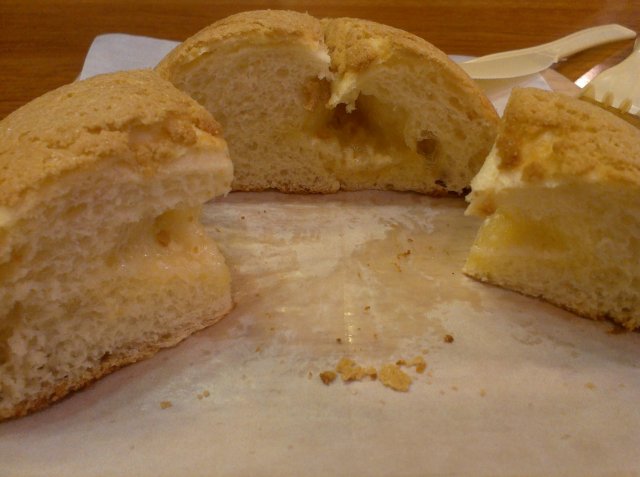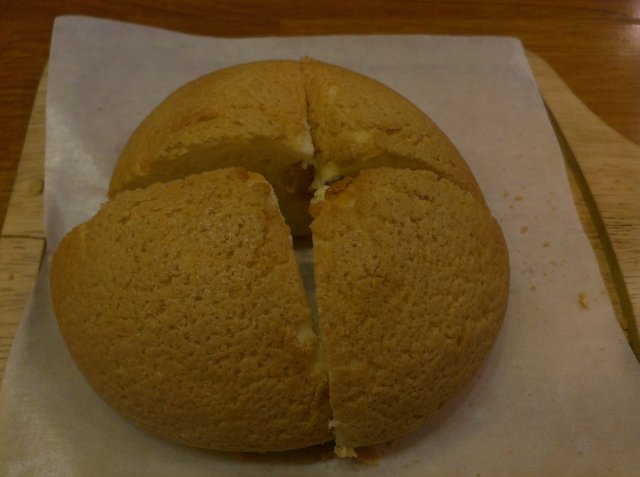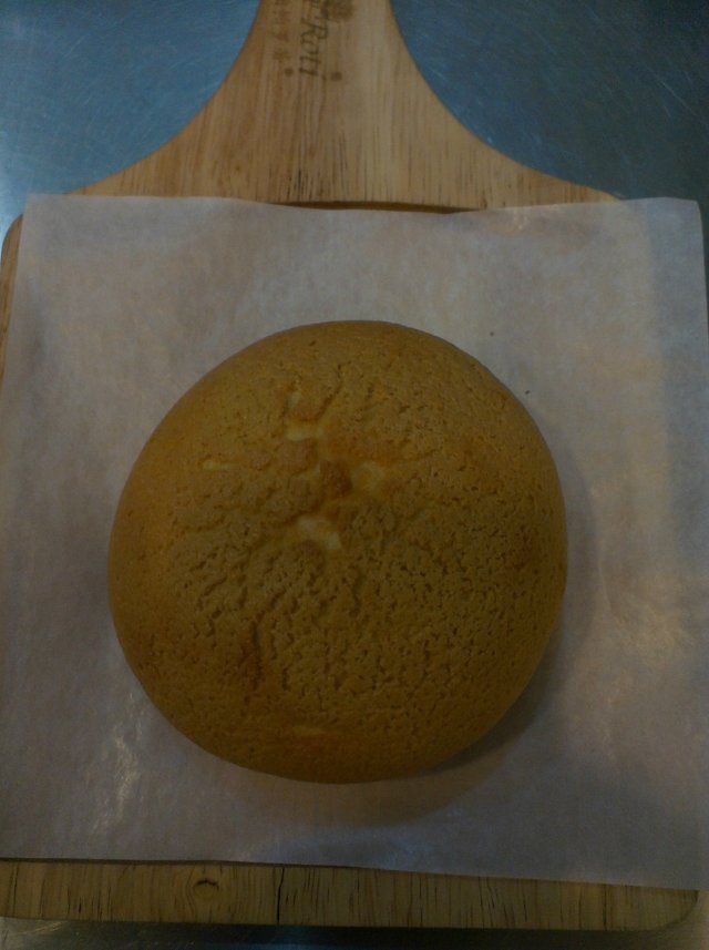 面包的外面,是薄薄的一层菠萝皮,和菠萝包上铺着的厚厚的菠萝皮不同,这个菠萝皮是融在面包上的,厚度不厚,所以吃在嘴里的口感,没有菠萝包那么甜。有着菠萝皮的面包,表皮吃起来有些酥脆的,而里面的面包,在高温的烘焙下,松软可口。整个面包吃掉,会觉得有些些小小的饱腹感。