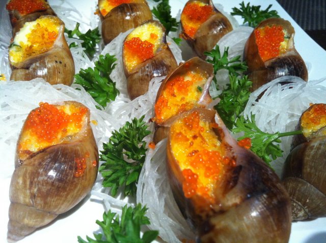 法式焗蜗牛,卖相很好,个头大且均匀,由于蜗牛肉是加工好后再放回壳内以芝士封口,所以用筷子即可把肉挑出来,鲜滑肥嫩,爱不释口啊!