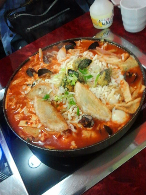 奶酪年糕很特别,热的时候吃可以看到一丝丝的奶酪,拉的很长的,冷了就黏在一起了,还点了好多配菜,鱼饼,乌冬面,鸡蛋三个,火腿,煎饺,紫米卷等,统统做在一个锅子里,一大锅啊!