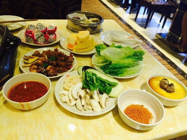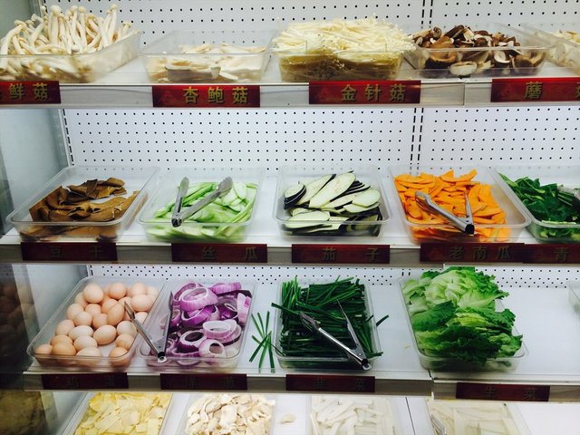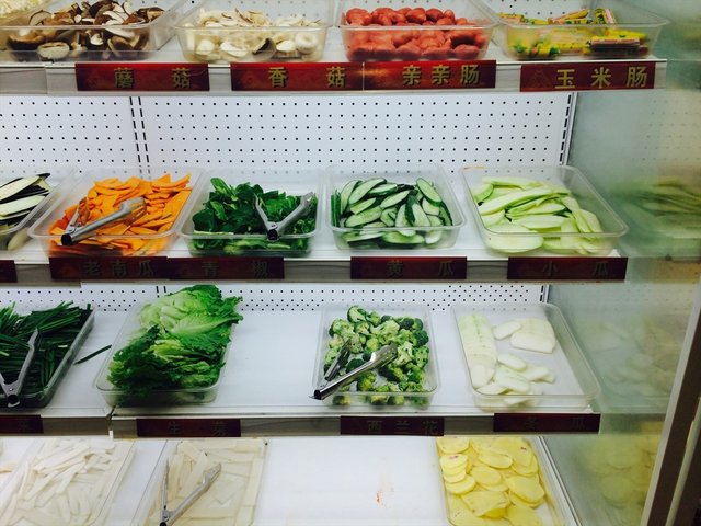 素菜的立柜上主要有:土豆、茄子、金针菇、蘑菇、香菇、黄瓜、南瓜、西兰花、生菜、豆干、洋葱、鸡蛋等。那天就吃了点青椒,和藕片,主要是奔着肉去的。后来用洋葱圈烤了个鸡蛋,超级有趣。