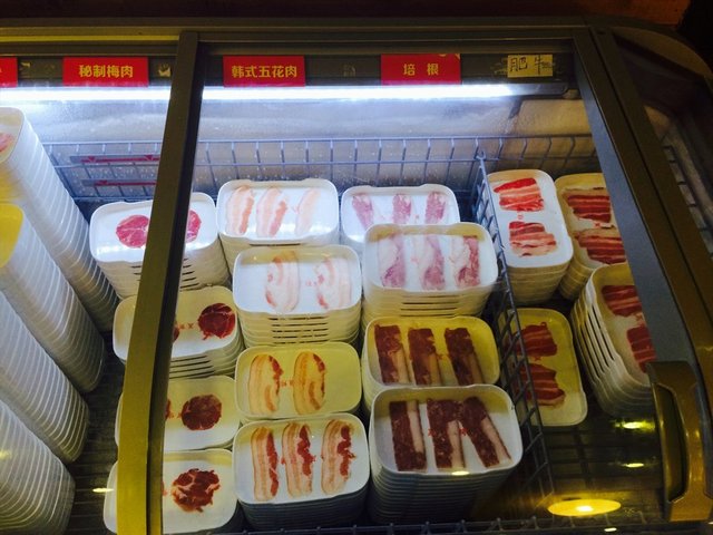 然后往里走,就可以看到一个冰柜,里面主要放的是韩式五花肉、肥牛、梅肉、培根等,
