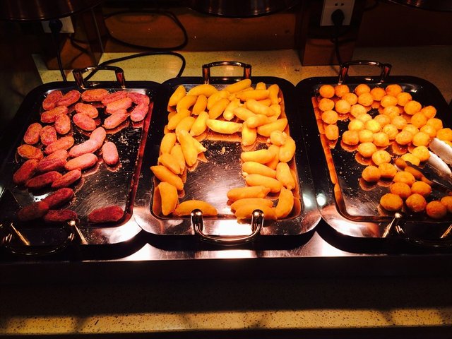 熟食区的热菜种类也很丰富,吃了点炸土豆,炒鱿鱼,鸡肉,味道都还不错。