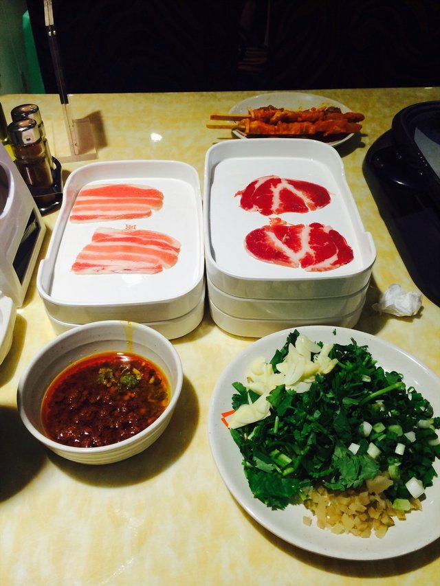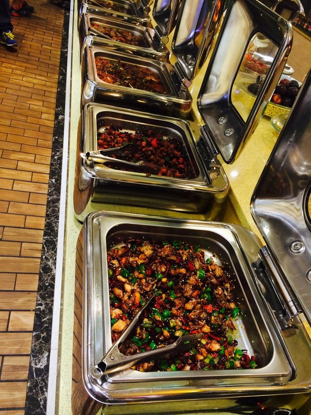 立柜里还有其他腌制的荤菜类:传统羊肉、丁香鸭烧、藤椒鸡柳、骨肉相连、红油鸭肠、鸭胗、豆豉秋刀鱼、咖喱鸡排、传统牛肉、鱿鱼等,对腌制的不感兴趣,就拿了些五花肉、肥牛等,一盘只有两片肉,虽然这样避免了浪费,但是来回跑好累。烤肉配韩式烧烤酱超级好吃的,再裹上生菜,味道很不错。