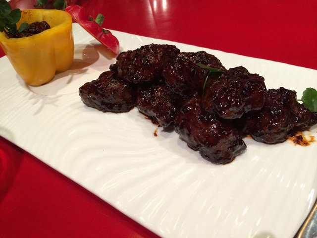 【黑蒜澳洲和牛粒】现如今,和牛用中式烹饪手法呈现越发的稀疏平常,但就怕火候过犹不及,糟践了雪花肉的细嫩多汁。切下第一道,悬着的一颗心就落地了,完美的7分熟之红,脂肪和黄油交相提供的脂香,搭配厨师自制的饿完美黑椒汁,好吃得跳舞转圈圈!