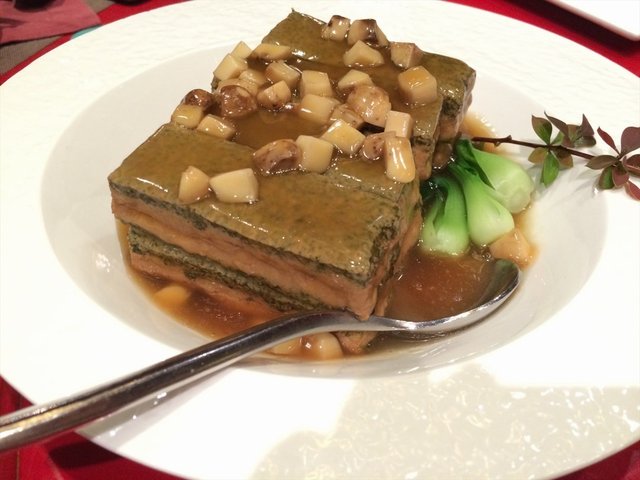 【碧绿滑子浮】鸡蛋豆腐本身不如一般的菜馆味道好,够嫩,但不够绵密、不够滑爽,且菜泥的存在感不足,还好,点缀的牛肝菌粒和松茸粒的菌香为整体味道扳回一城
