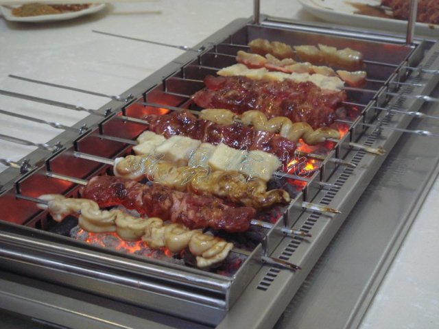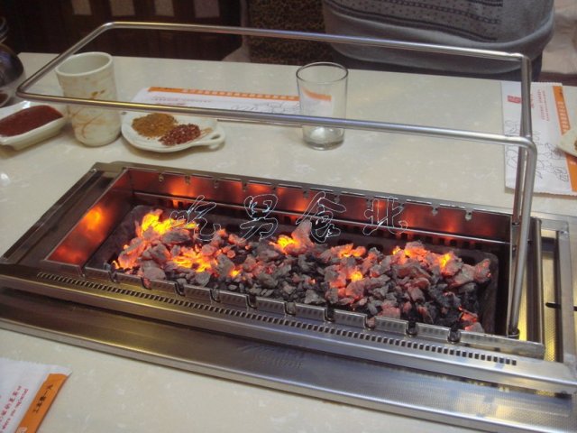 每个桌子上都有一个特制的烧烤器具,这器具非常神奇,可以自己烤,基本不用人来管。上面有个支架,烤好了之后可以放在上面,下面是凹进桌子里面的坑,用于放炭火盆,器具的两边有小凹孔,而串儿的钎子上有齿轮,齿轮刚好嵌在凹孔中,架子被驱动左右移动,串儿就自动的旋转烤制,真的是很方便,老板很具有创新意识阿,这种神器,我是第一次见,很好玩!