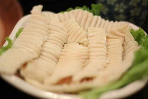 鹅肠和鸭肠:鹅肠和鸭肠的区别并不大,食材足够新鲜,鹅肠略粗,肠壁略厚一些就此而已。吃这个主要功夫在涮上,大家都知道14秒的时间吧,其实手法很重要,把肠放到锅里面要不停的让食材在汤里面滚动,不论是七上八下,还是左右来回的晃动,总是就是要让食材在汤中动起来,这样受热均匀,食材略微卷起就可以了。时间不能长,时间长了就会咬不动了。
