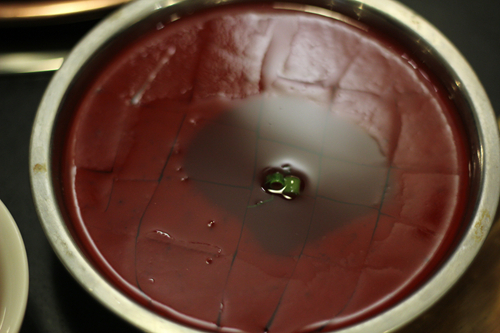 鲜鸭血:最后吃的就是这个鸭血了,要将鸭血慢慢的滑到锅里面,不要动,等鸭血慢慢浮到水面上来,颜色变成土红色,比没煮的时候膨胀起来就可以吃了。千万不要等到煮的变小了再吃,那样口感就变得干涩硬了。