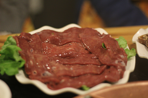 牛心片和牛肝:吃这个必须的干料味碟,干料碟没有大家想象的那么辣。将牛心片和牛肝方的锅中,要是不是的搅动一下,让锅里的温度均匀才好,等到原料僵直,颜色变的没有那么鲜艳了有点土灰色的时候就可以吃了,占下先占香油味碟或原汤味碟,再蘸干料碟。