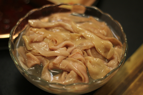天梯:大多数人都不知道这是个什么东西吧,我也是第一次品尝到,说白了就是猪上膛。涮锅的时候要把这东西先下锅煮,大约煮15分钟以上,等到吃起来有胶质感和拔丝的感觉觉得时候就是最好的了。天梯自身没有味道,你想赋予他什么样的味道他就是什么样的味道,适合各种的附加味,有的只是煮好以后的口感。