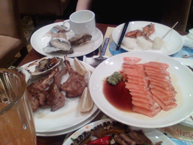 生日去了正大广场7楼的喜多屋国际海鲜料理,放开随便吃啊,去吃的人很多的,桌子不是很大的,2个人一个的位子,放不了几个盘,基本上每人拿2盘东东就满台了呢,收骨碟的服务员很勤快的,看到桌子上面有骨头什么的就主动来清理,不用我们多操心的,三文鱼刺身放出来的时候要速度去拿,不拿可能又要等下一轮了,三文鱼刺身切了有些薄了,没撒摆盘的,纯粹就是吃的,没撒美感,味道不错的,很新鲜的,其他烧烤类的是放夹子到盒子里面,烤好会有服务员帮你送上来的,吃的人多,难免混乱,烤物等的蛮久的。整体性价比高,值得推荐。