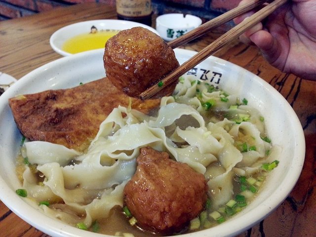 #刀削面# 经典面,大部分人都点这个,那我也尝尝,里面可以加三个特色小吃,虎皮蛋,豆干和丸子,我怕吃不了,所以加了一个虎皮蛋,蛋表是用油煎过的,还蛮有特点的。面条很厚实,毕竟是刀削面,他家一绝的是辣酱啊,特别辣,稍微拌上一点点,就已经辣火朝天了。