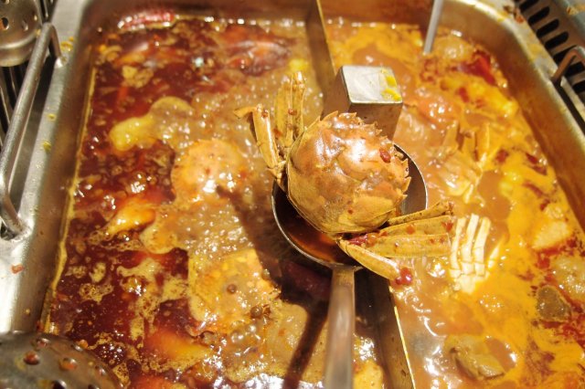 旭偉蟹黃墨魚滑是食友極力推薦的,起初以為是單純的小毛蟹,但揭開蟹蓋,方知道另有乾坤,蟹蓋內早已釀入墨魚滑,原隻放入已經濃稠得似麻辣醬的湯內,怕死的我,焯了超過十分鐘,舀上來的一刻,有點像從火山溶岩內冒出來一樣,其實除了墨魚滑之外,蟹肉太少,沒什麼嚼頭,大概是啜啜帶點蟹肉的湯汁。