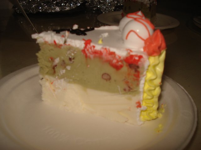 我是2月5号取的蛋糕,当场也没注意,吃了一大半才看到,底盘上写的日期1月24。晕!突然意识到他们家团购的蛋糕大概都是时间久了各门店没卖出去的,所以要提前几天预约,他们还要电话询问,哪家门店有“旧蛋糕”。虽说冰淇淋这玩意,本来也能在速冻层放好久,可是买到十天前生产的冰淇淋蛋糕,还是有些别扭!这款蛋糕口味是抹茶红豆的,口味偏淡,不会觉得很甜。