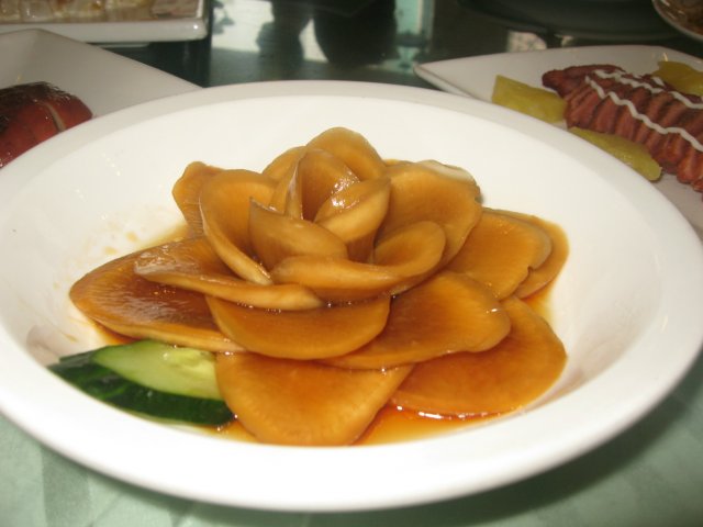 鲍汁扒海参,这年头海参贵啊,摆盘上周围铺了一圈西兰花,海参和菌菇烩在一起,QQ滑滑的,好吃。