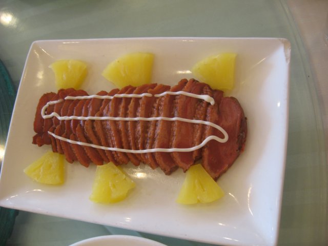 菠萝鸭脯,量满足的,鸭胸肉切片,旁边放了菠萝块装饰,鸭肉的味道不错,不过并不是我想象的用菠萝和鸭肉同煮,让鸭肉带菠萝的香甜。
