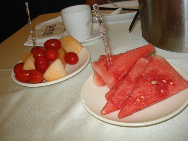 调料水果,八块钱一位,自助的,每次调料自助,我都调得乱七八糟,不知道是个什么味,呵呵,不过也不难吃啦,喜欢XO酱、沙茶酱、麻油等。水果这次有西瓜、哈密瓜、小番茄。还有些泡菜、花生米什么的吃吃。