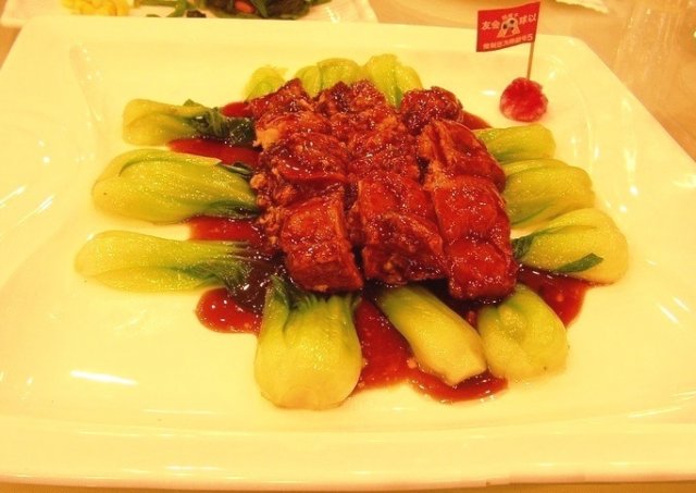 另外要了一烧肉,具体名字是啥不知道,这道菜上来后我们很意外,因为除了肉块外,居然用一切两半的小油菜垫底摆盘,烧肉放在上面,淋上较浓的汤汁。菜和肉的搭配很合适,既不会太素显得口味寡淡,也不会太腻口,而且有荤有素营养均衡。