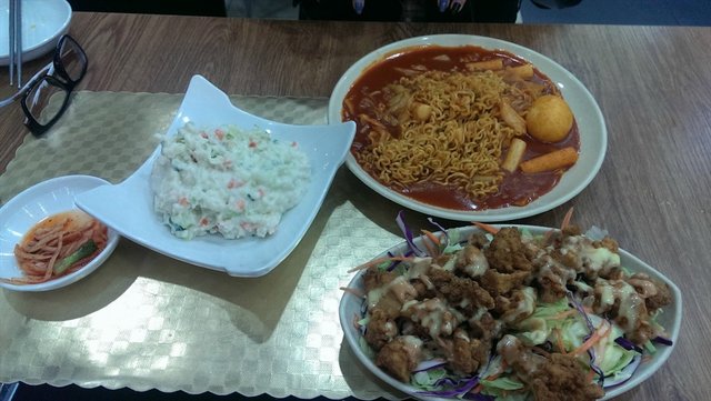 两个人,看旁边的人吃的挺香的拉面炒年糕点了一个,土豆泥点了一个,再加了个炸鸡沙拉,一共49元,结果是没吃了。