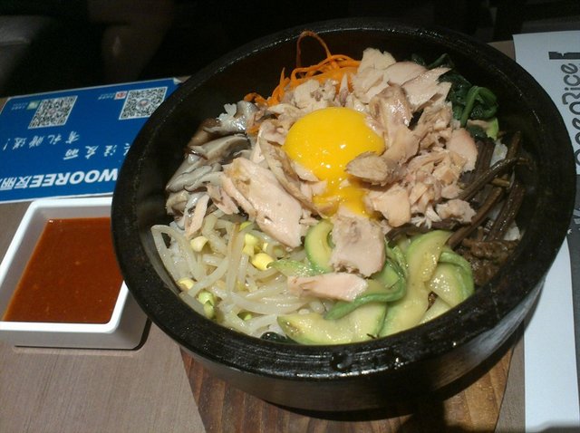 下面软糯的米饭,上面盖上了黄瓜,胡萝卜等素菜,还有金枪鱼和肉外加一个蛋,边上还搭配一份酱料,这个上来之后一定马上就要让人帮忙倒入酱料之后搅拌均匀,搅拌好之后最好马上就各自分入自己的小碗里面,这样饭不会过焦过硬啊,素菜和肉还有金枪鱼和酱汁搅拌一起味道很好啊,健康又美味啊