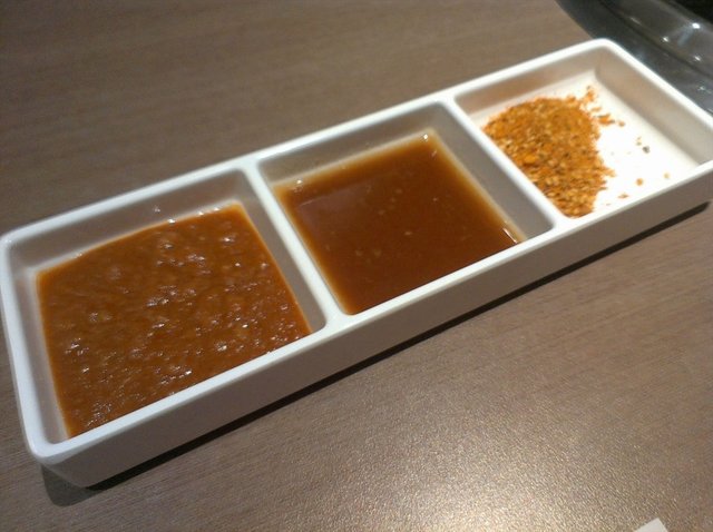 话不多少,开始烤肉了。店家提供了三种烤肉蘸酱,咸甜辣,任君选择。