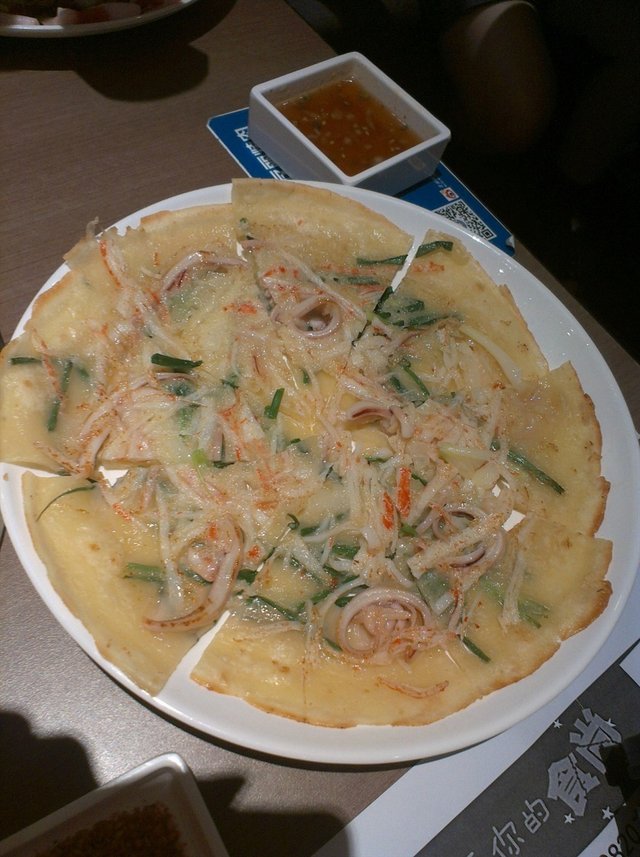 海鲜葱饼:上来的时候一块块分好的,而且边上搭配了酱料,葱饼很薄,外面的皮脆脆的,里面加入了很多小银鱼,让原本淡淡的葱饼的味道更加浓郁,如果觉得淡的话蘸上他们家的酱汁,酱汁味道不错也很好吃的,葱饼外脆里嫩,而且皮比较薄,没有批萨的太多面粉的感觉。