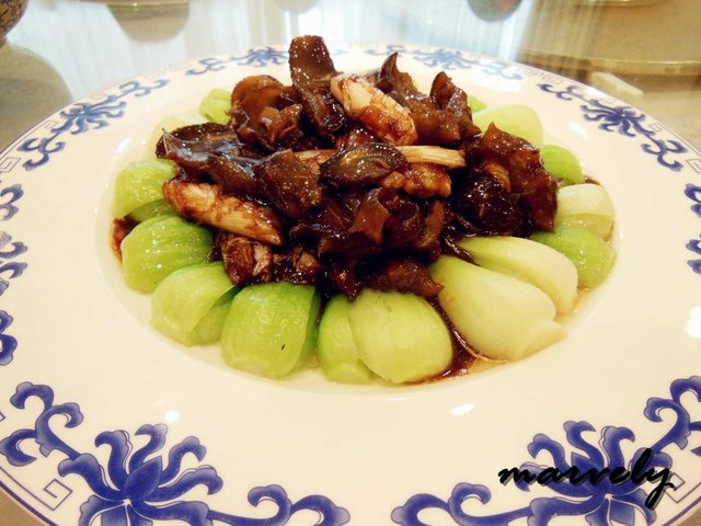 重头戏的海参啊。店家选用了打海参,整只烹饪过之后,切块继续酱烧,这样的烧法可以让海参很好的吸收调料的味道,所以吃在嘴里的海参,在不失Q弹口感的同时,很入味。海参下面垫着的青菜,裹着酱汁吃,同样很美味。