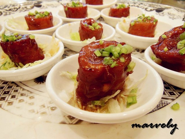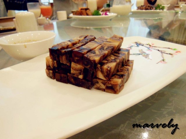 其实是肉冻,猪蹄肉在凝固的酱汁里,展现出美丽的纹路。入口,微酸的酱汁就融化在口中,牙齿开始咀嚼弹滑的猪蹄肉。