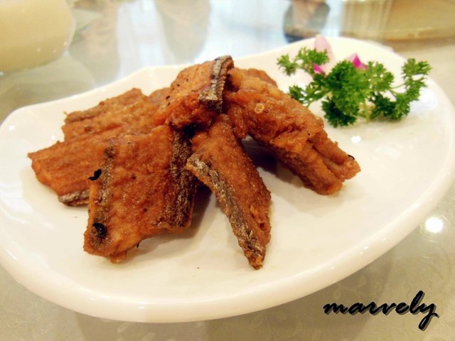 带鱼被煎至酥脆,里面的水分很少,但是吃起来一点也不影响口感,倒是觉得略柴的带鱼肉吃起来很有质感,且酱汁的味道很好的融入到了带鱼肉的每一个角落,吃起来口感一致。