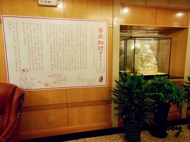 老山东的餐厅,和很多中餐厅一样,中规中矩的,不过红色元素在店里用的比较多,红色的牌匾、红色的地毯,还有红色的橱柜。和山东人红火的个性很像。