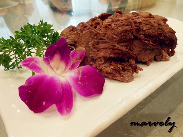 牛肉大块的,肉身上的纹理丝丝分明,酱汁其实不是那么浓厚,但是牛肉被酱到软硬适中的程度,牙齿一撕扯就烂开了,很容易咀嚼和下咽。