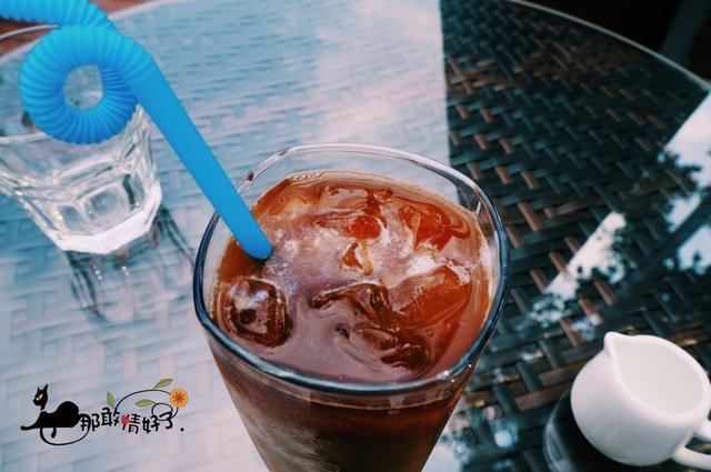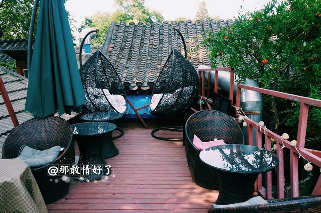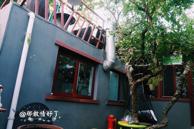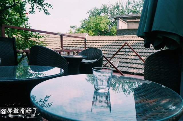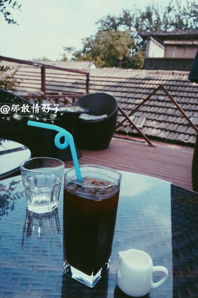 我浏览了一下北房和南方,都是很优雅的散座。登上露台,迅速抢占仅有的两个吊式沙发,跟姐们窝在里头睡了。吹着风,四周是树,不会白阳光暴晒,太舒服了。刚吃完午饭,就喝了杯美式刮刮油。看菜单被价格惊呆,15块一杯,2003年的星巴克冰咖啡12块啊,十年前的价格在这么好的地段,极品的环境实属不易。其他菜品价格也一样便宜。