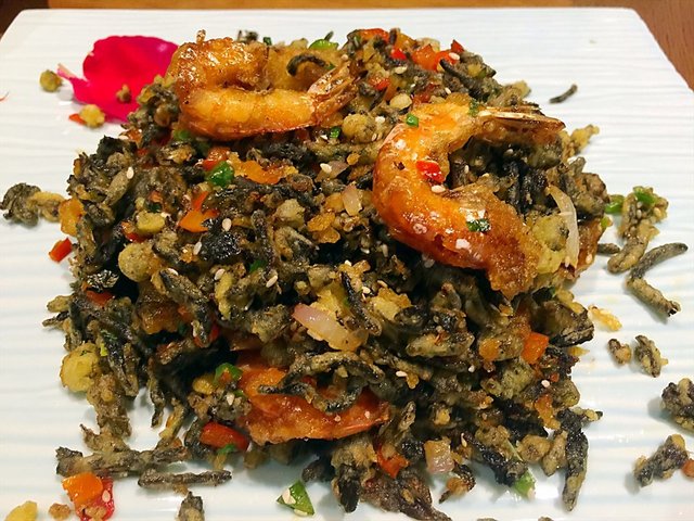 这个很特别,也是第一次吃这样的虾,跟茶叶一起炒,虾是炸过的,所以特别的脆,茶叶也是炒过的。本我以为只能吃虾,茶叶只是个配菜的样式,然后服务员看到我们剩下茶叶的时候,友情提醒我们茶叶也是可以吃的,小尝了一口。发现很香很好吃。只不过茶叶量大,吃不完。