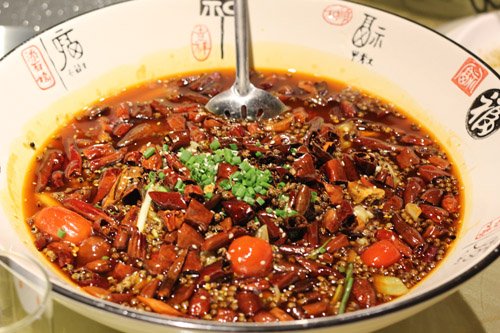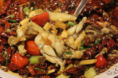 渝川沸腾蛙:由于其后肢弹跳发力导致肌肉发达,其肉质也特别的鲜美、细嫩,小蛙仔比起大的蛙更加有过之而无不及。重油让蛙肉更加有美味感,辣椒红亮养眼,辣而不燥,麻而不苦。