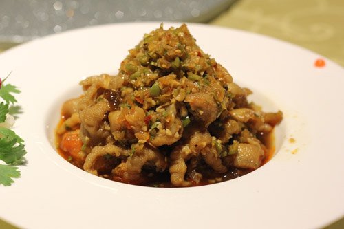 秘制凤爪:凤爪已经将骨头去掉了,凤爪吸收了调味汁的鲜、香、麻、辣、甜,经过在调味汁中的浸泡,有色调味至的颜色已经将凤爪的颜色变得深红,略成酱色。