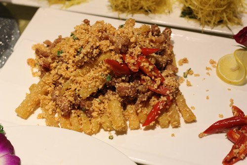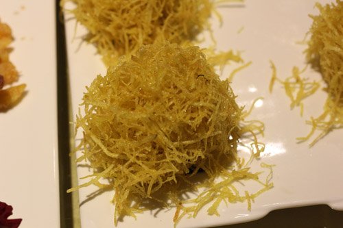 芥末虾球:这个菜叫芥末虾球,真心的叫人体会不到它自做的独特之处,我感觉叫金丝芥末虾球更贴切。土豆切成极细的细丝,放的油锅中,炸制颜色金黄,口感香酥脆。将大虾与芥末和做沙拉的酱一起调匀,裹上炸好的土豆丝,裹金丝的时候要裹得裹得够紧,金丝不脱落为最佳。芥末的微辣、沙拉酱的滑、虾的鲜、土豆的丝的酥脆,就这样被厨房魔法师融合到了一起。