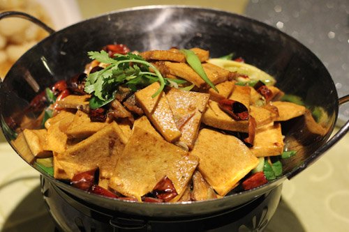 蜀香鸡柳:这道菜的灵感来自台湾小吃盐酥鸡,创新的将鸡肉和薯条融合炸制,配上川菜特有的辣感,一口下既酥脆又绵软。看似普通却巧有心思,盐酥鸡、红薯、炒混合的香料,很有金沙炒的味道。