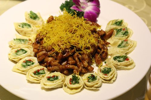 春色满园:京酱肉丝和素卷丝的完美结合。京酱肉丝做的是偏甜口的,肉丝鲜嫩,吃完后盘中略有油无汁。再加上炸的金黄土豆丝,与肉丝一起吃,将一道老菜赋予了新的口感。素手卷是鸡蛋皮加上了点蔬菜,单独吃起来更家具有滋味。