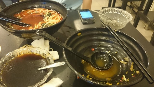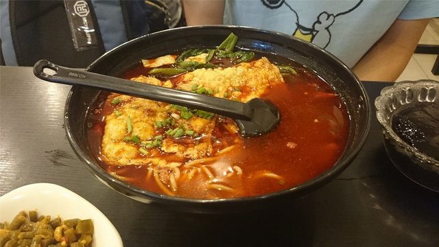 大碗螺蛳粉15,辣度只有三个等级,微辣中辣特辣,选了特辣,红红的一大碗。可以根据个人的量,让店主少放粉,多放其他的配料。特辣真的是辣到菊花残的程度,没有一定承受能力还是不要尝试了。桌上有泡椒,可以自己加,偏酸,不算太辣。