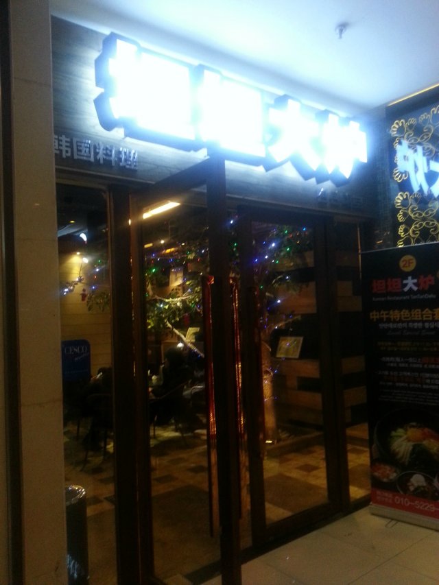 这家坦坦大炉望京店位于朝阳区湖光中街西口教文大酒店2楼, 挨着海底捞火锅店。 在北京只有两家店, 另外一家在五道口,是北京的第一家分店, 开了很久了。 这家店因为开业不久, 去吃的时候还有88折的优惠。周一至周五还有送主食的活动, 就是每点一份烧烤送一份主食, 挺划算的, 因为是周末去的所以没有享受到这个优惠。