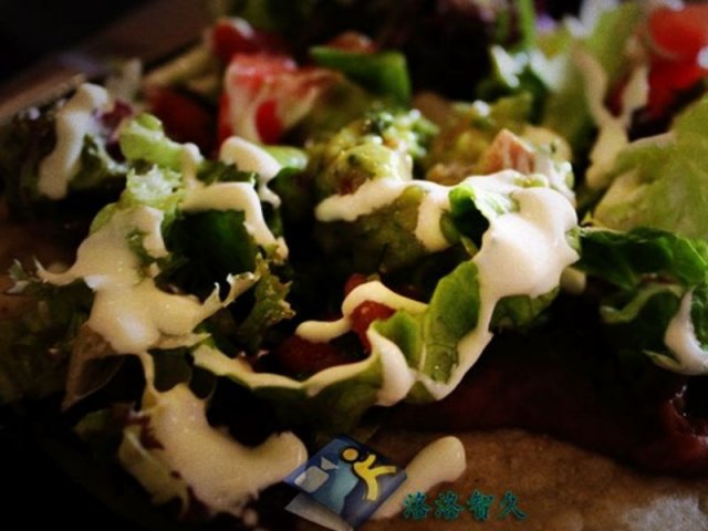 芝士豆馅墨西哥脆圆饼,脆圆饼上洒着蔬菜,豆制品和奶酪~这个有些吃不惯,觉得豆制品酱料的味道有些奇怪~上面的蔬菜当蔬菜色拉吃了,觉得食材还是很新鲜的~