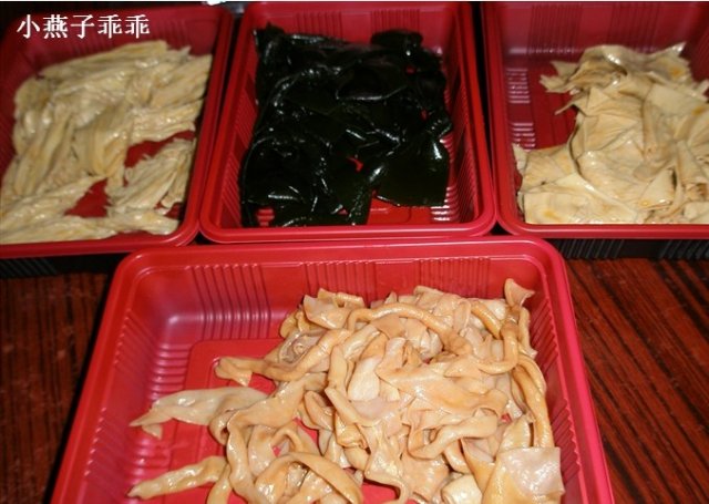 我比较中意这种口味的素食,所以买了一盒豆腐皮5元的,感觉汁水很多,泡的软软的,口感不错。一盒是腐竹,也是5元的,比豆皮会硬上一点点,虽说都是豆制品,但是是完全不一样的口感,都很不错。就是豆制品吸辣很厉害的啊!不过这个辣不上喉咙的,所以我虽然不怎么能吃辣,但还是可以接受的,而且有着一丝丝淡淡的甜味,我喜欢的。鸭肠还是鹅肠来着,12元一盒,本来我是觉得这玩意儿没啥好吃的,但是试吃的男生说这个很好吃,强力推荐我试试,不试不知道啊!真的味道好棒啊!肠子一点点都不老,也没有异味,脆脆的口感让我一下子就喜欢上了,不错!送的选了海带结,这个有点不是很好,有几个不是很挺括,有点软软的。不过味道还行。