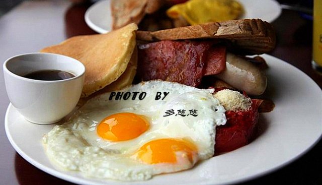 蓝蛙特色早餐:我点的,简直就是个拼盘!煎的鸡蛋、培根、火腿、香肠,还有松饼、土豆泥、面包等等,吓死我了!噶许多!