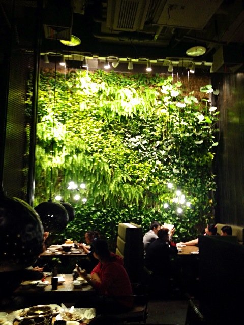整体装修是暗黑色调 没有服务员带路我觉得我估计会迷路 走进去的一个亮点是有一片墙那里整片都是绿色植物 但是没有大桌位置