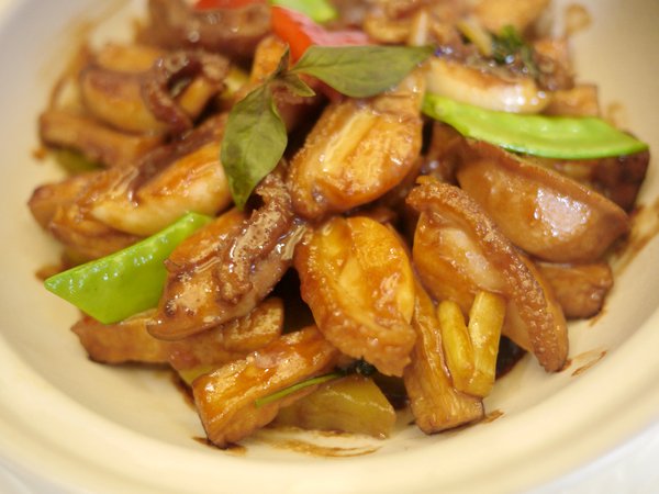 【三杯杏鲍鲜鲍】三杯鸡的做法,用料改为鲍鱼和杏鲍菇,还有青笋和荷兰豆做点缀。鲍鱼切一半倒是更方便食用,青笋非常入味,九层塔的香气不太明显
