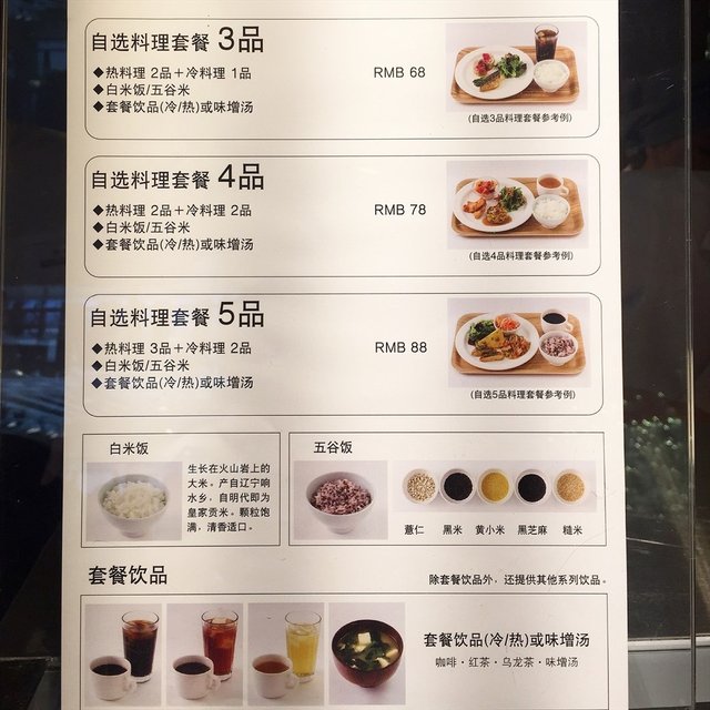 三品的两个热菜,一个凉菜和米饭饮品,68元。